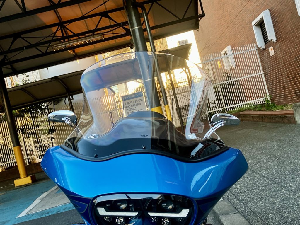 普段は見栄えを重視してHD純正OPのちょいョートなスクリーンを装着しており、下道の速度域ではジェットヘルメットのシールドを1/4ぐらい開くことでオーディオを聴きながらそれなりに快適に走れます。しかし、高速巡航時はスクリーンで防ぎきれない風が中途半端にヘルメットにびゅ〜びゅ〜当たり続けて、オーディオの音量を上げてもほぼ聴こえなくなってしまいます。